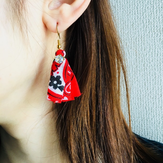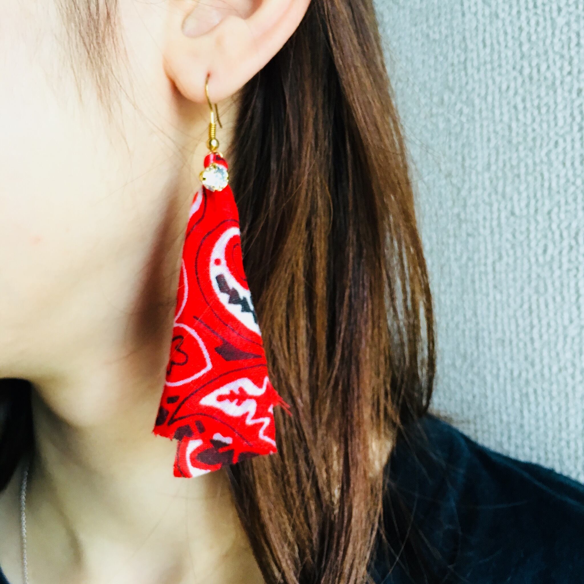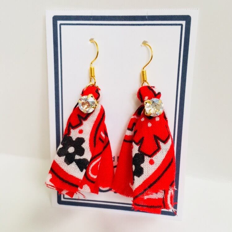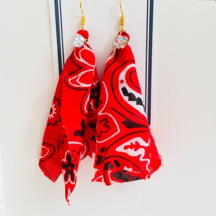 赤のバンダナ生地を スワロフスキーでとめてます♪