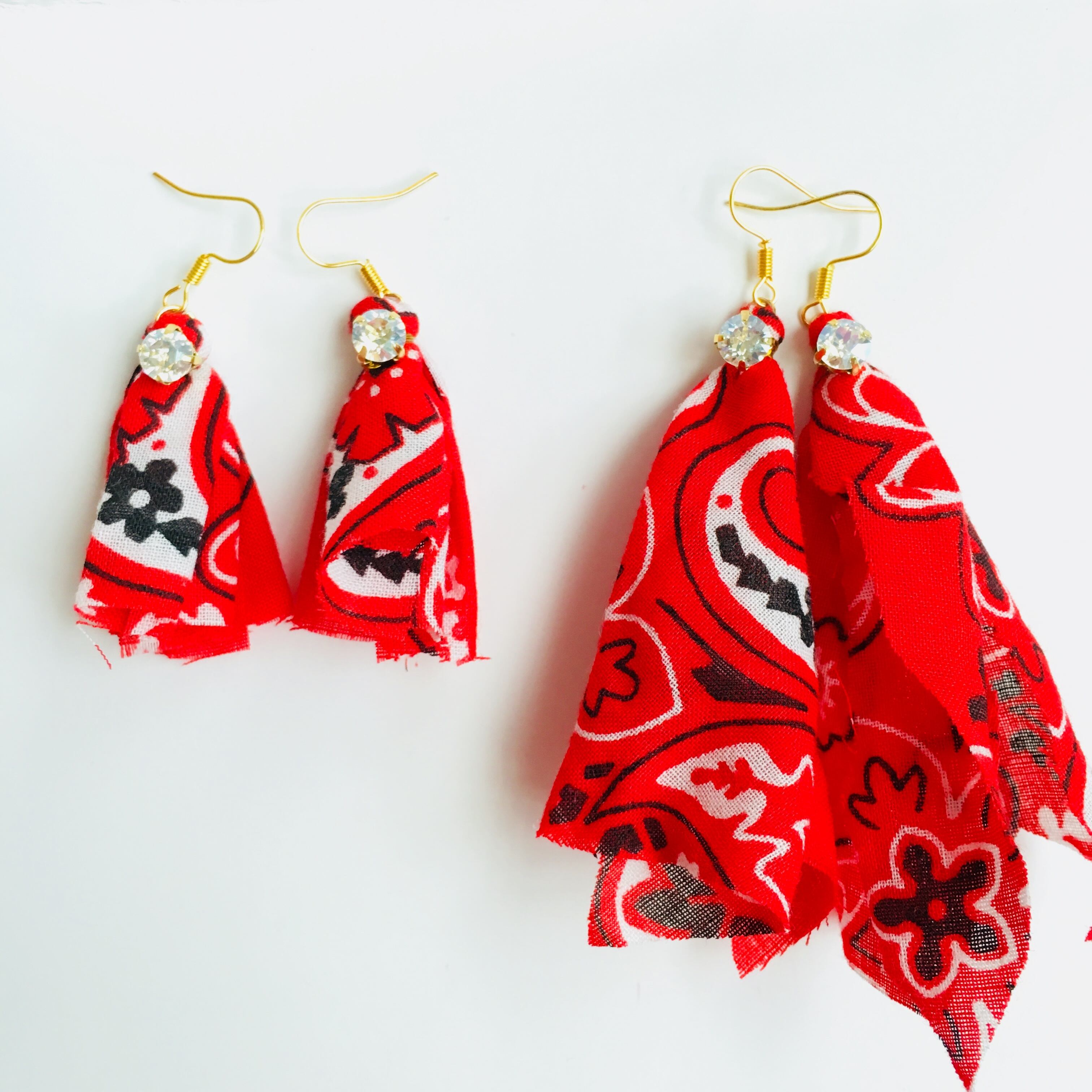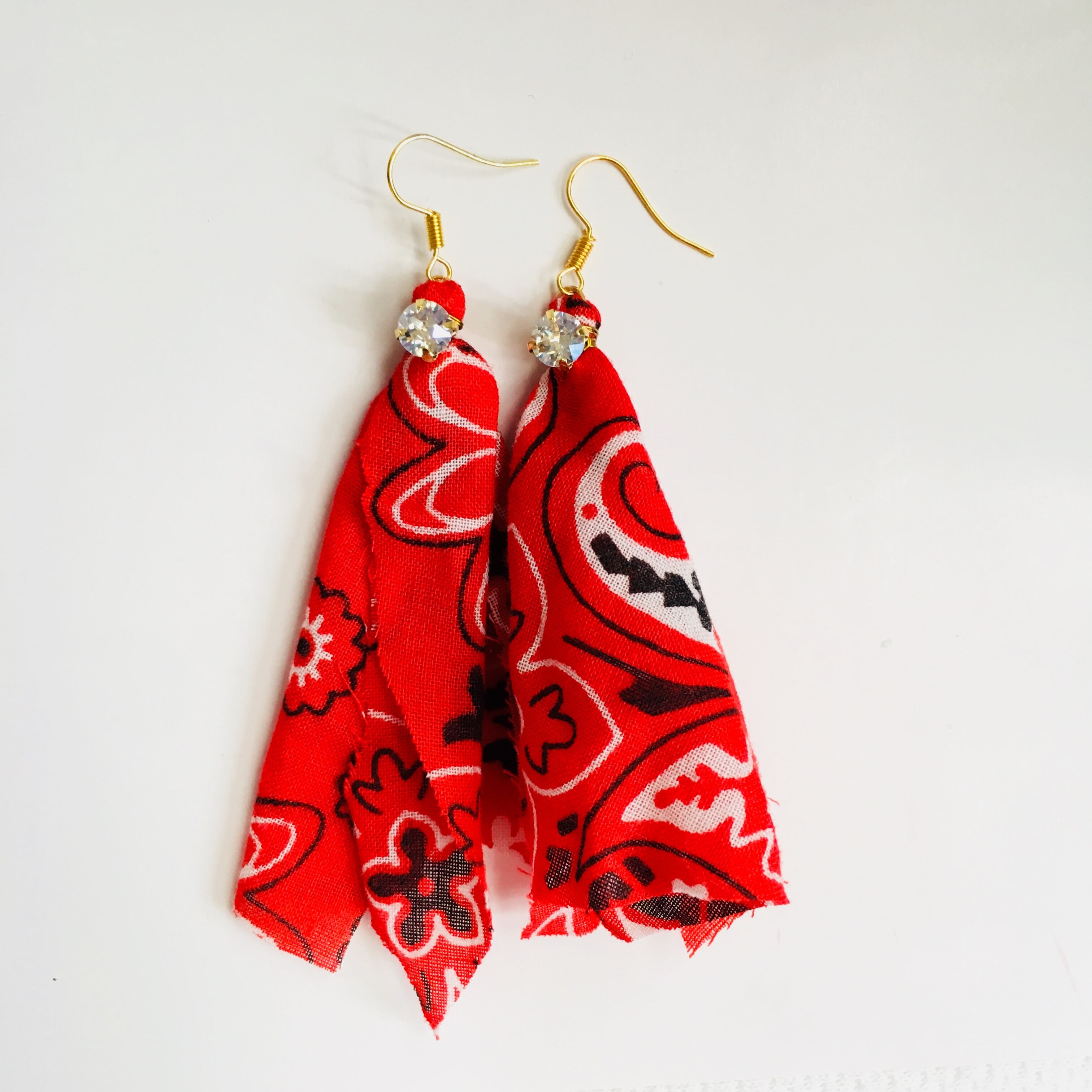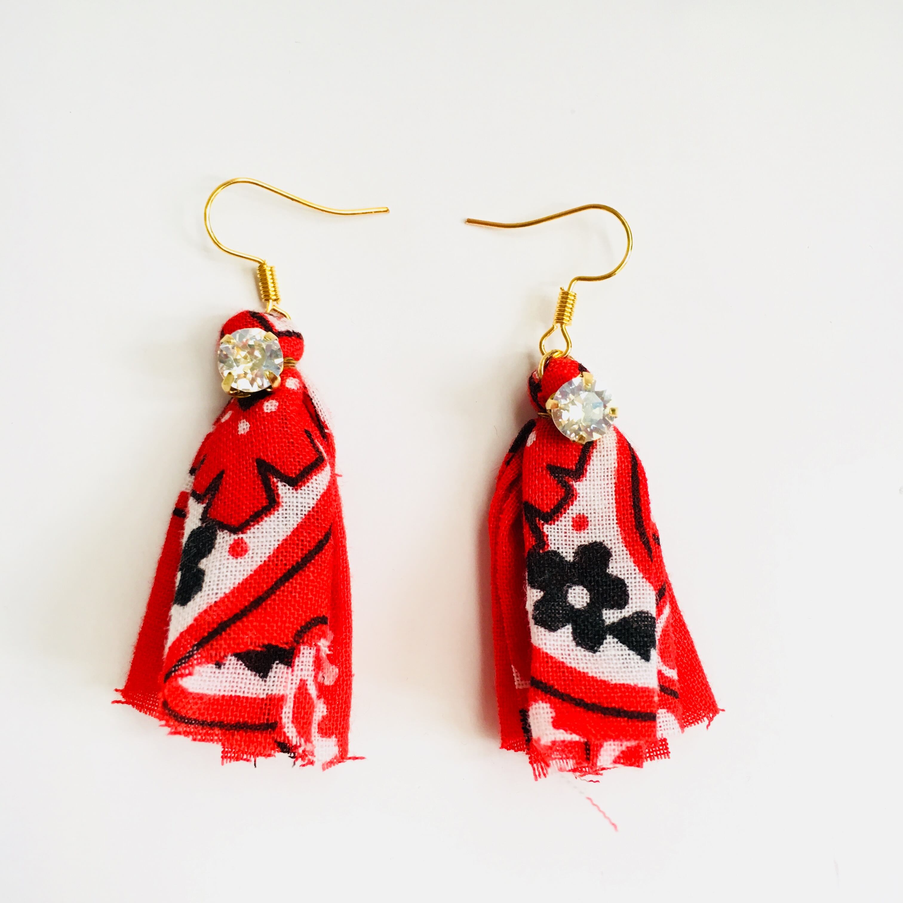 赤のバンダナ生地を スワロフスキーでとめてます♪