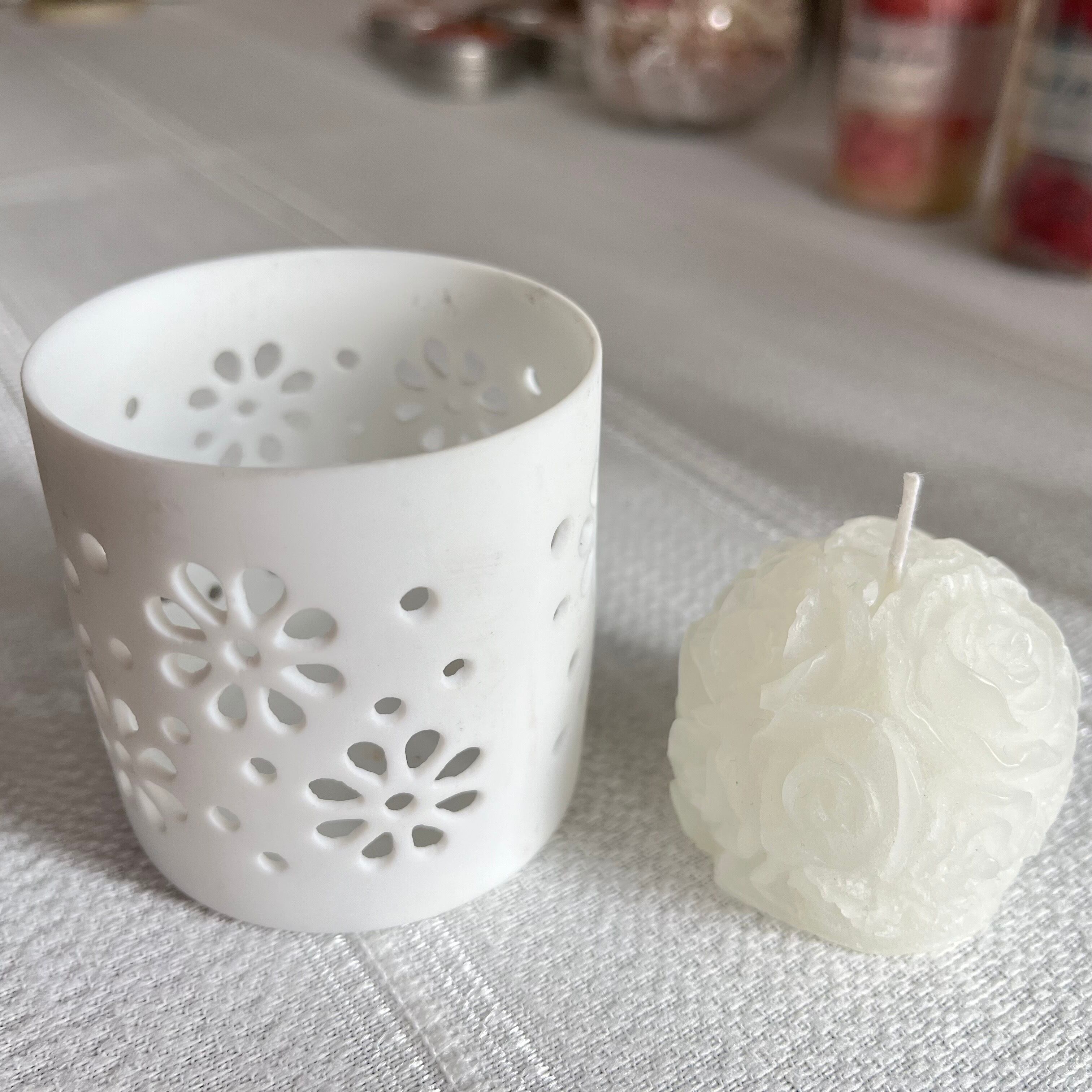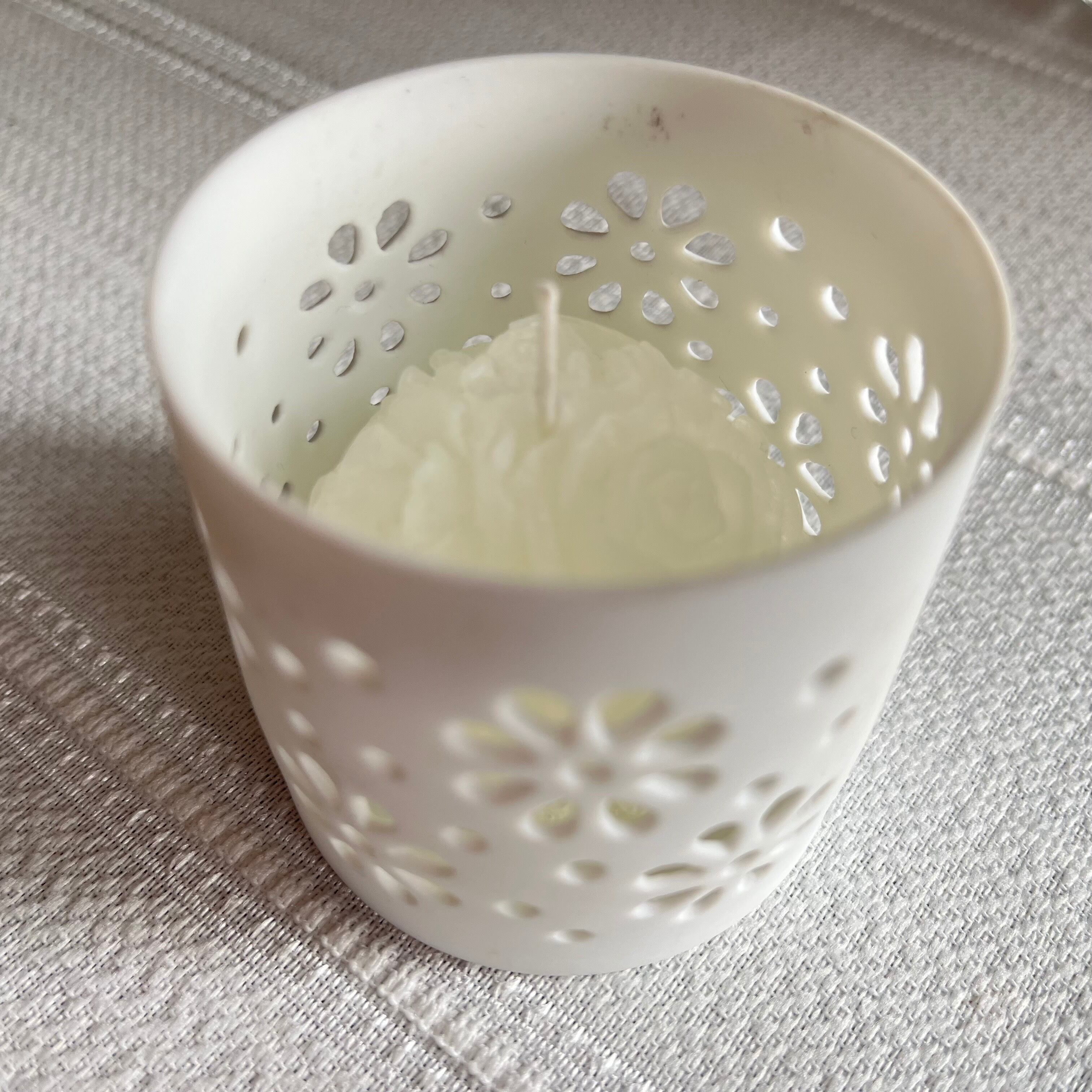 ま~るいキャンドル、全面にバラのお花の模様が入っています。キャンドルホルダー付きなので、手軽におしゃれなインテリアを実現できます。