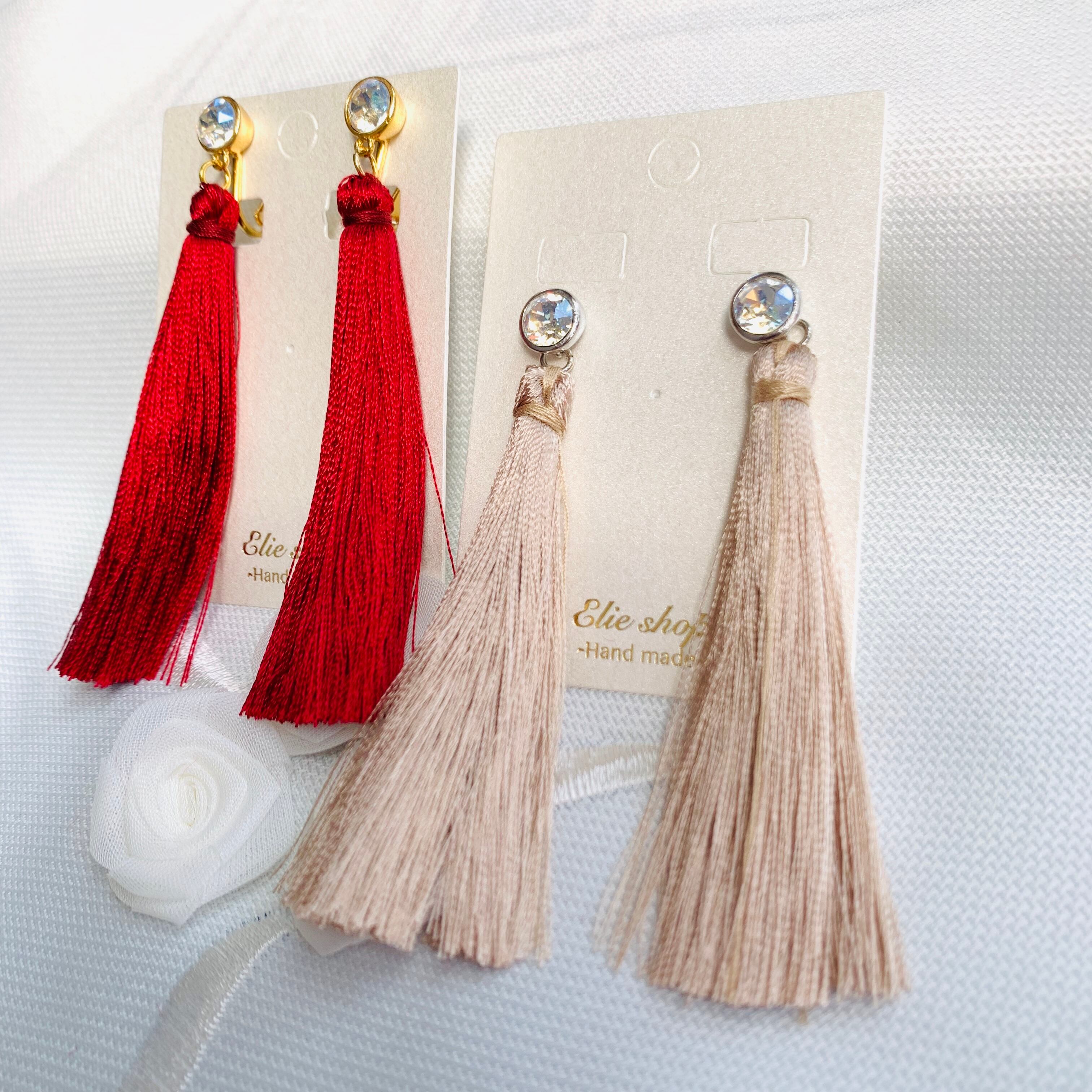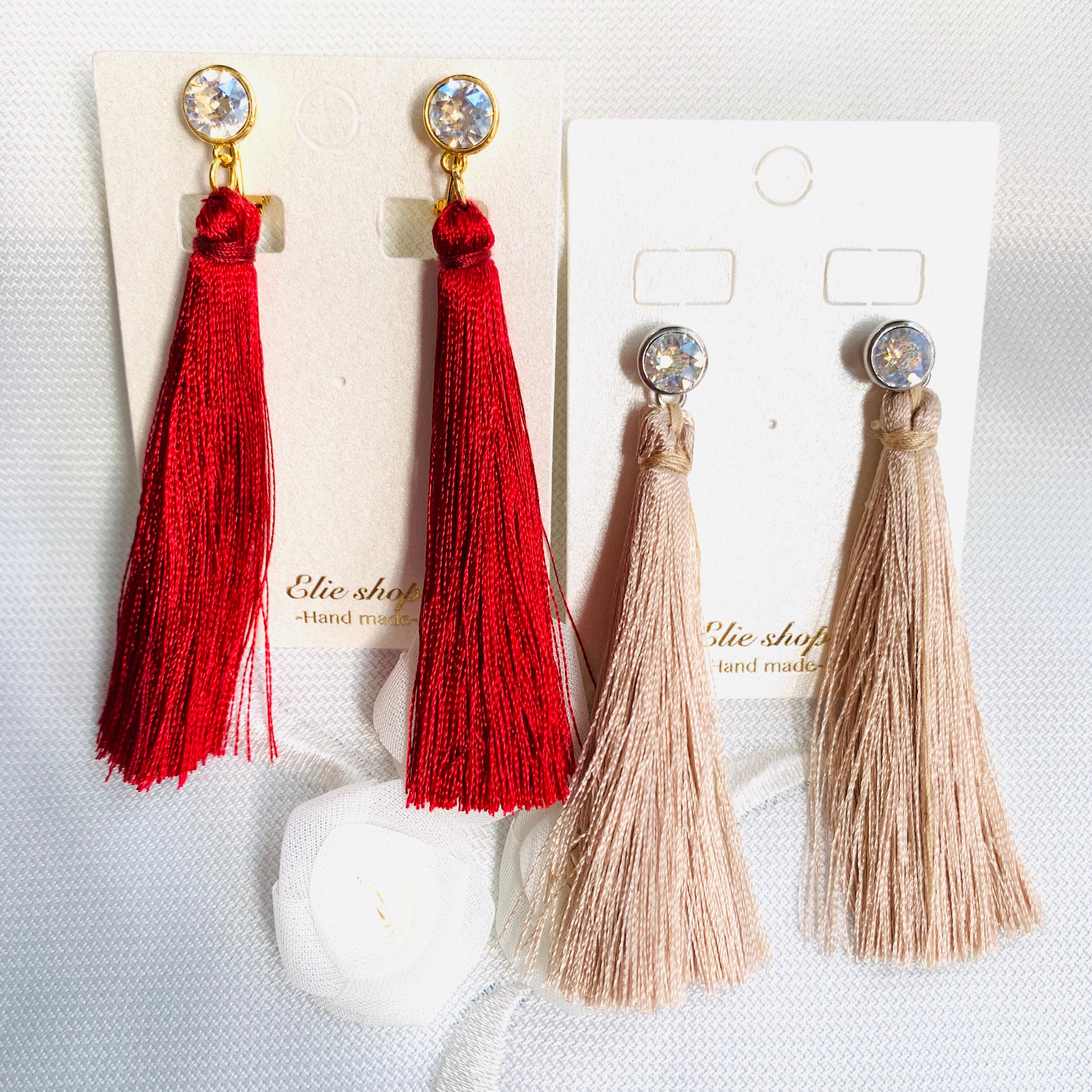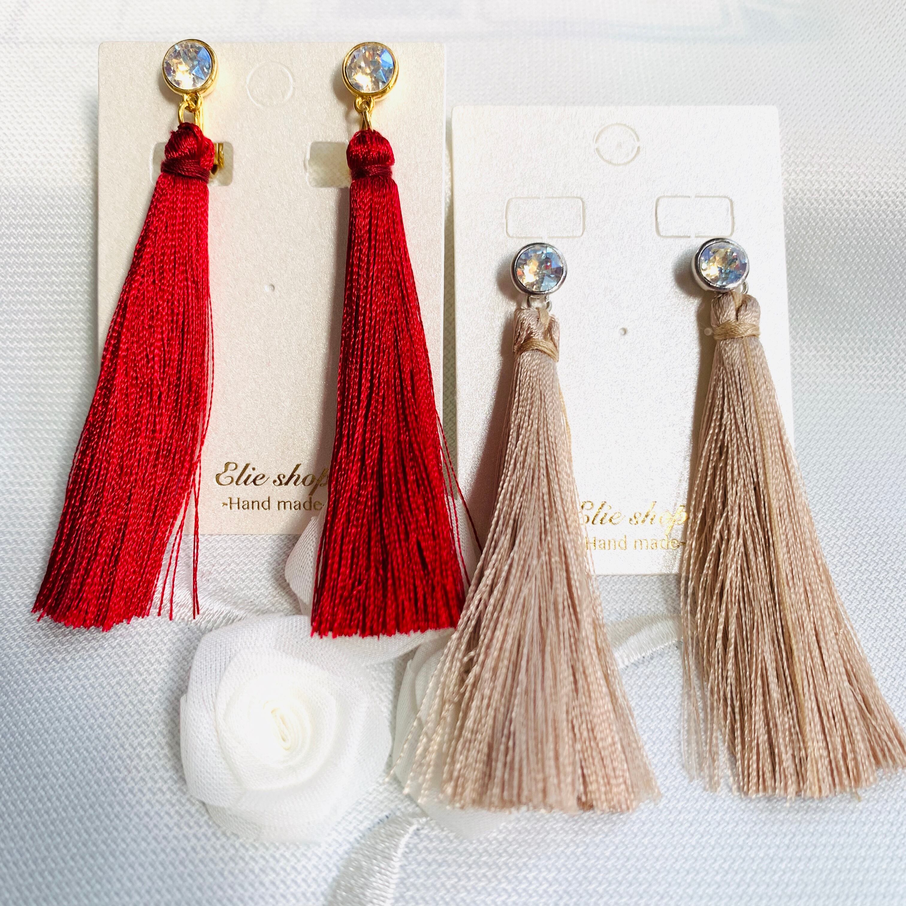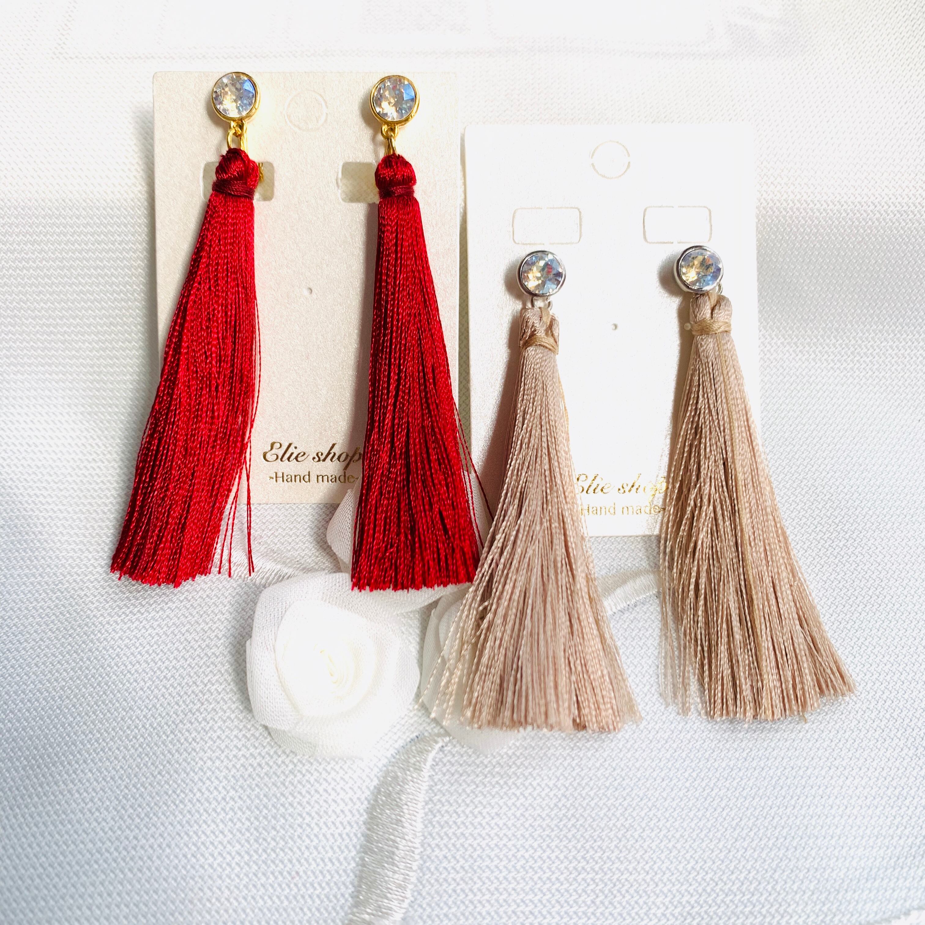 大人っぽいくすみカラーのロングタッセルを合わせました。