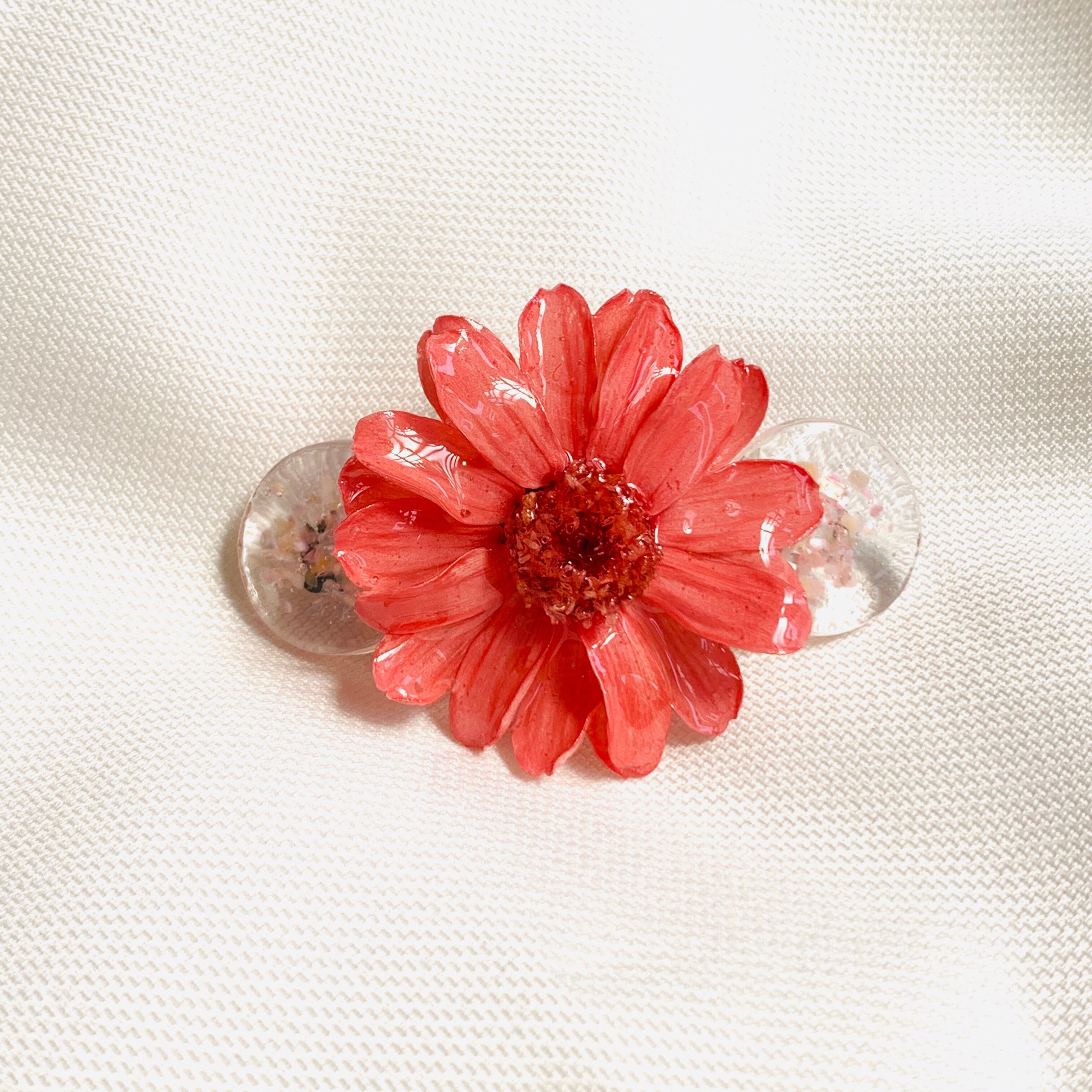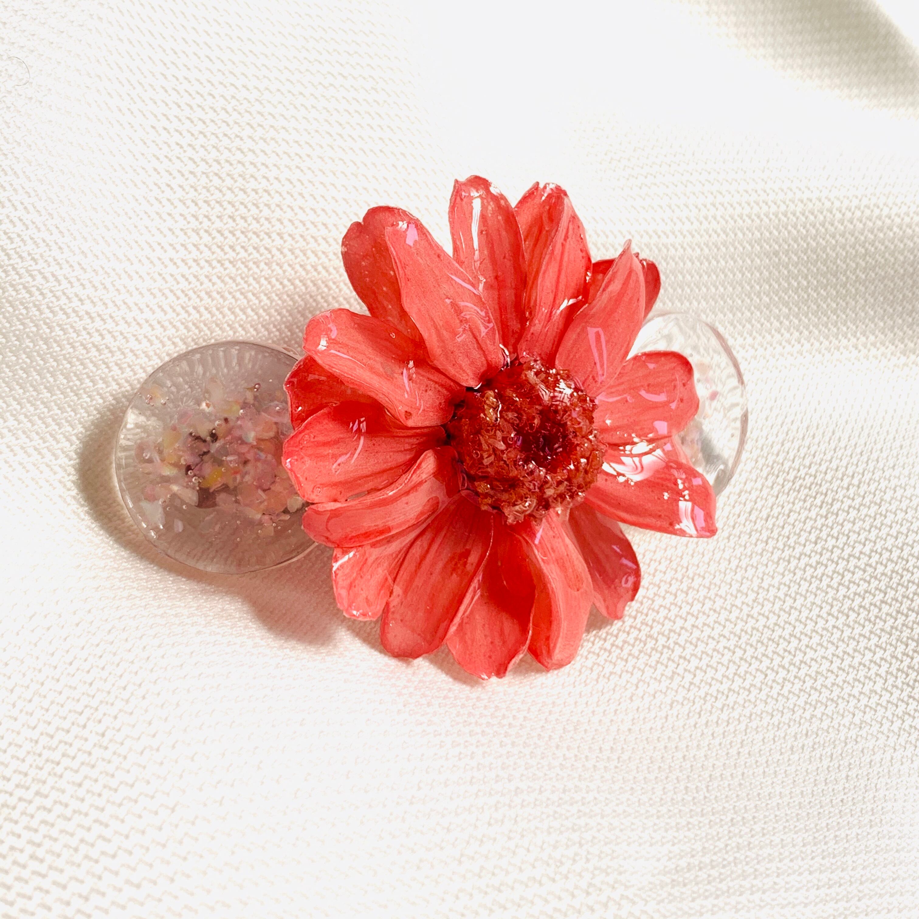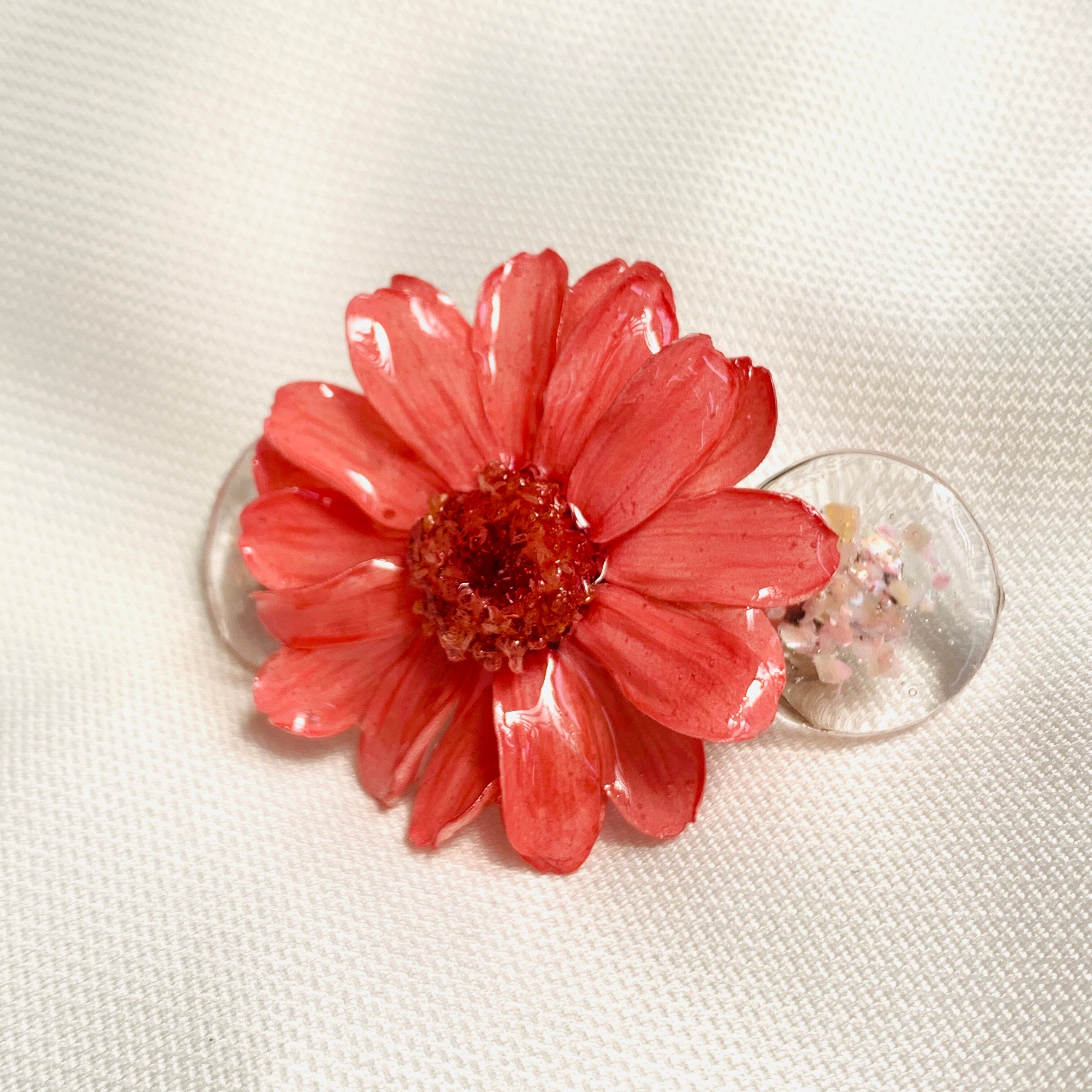 本物のジニアを使ったヘアバレッタです。 ジニアのお花は直径4.5センチくらいの大きさで、 ワンポイントに◎ ヘアアレンジしたくなるこれからの季節にぴったりです♡