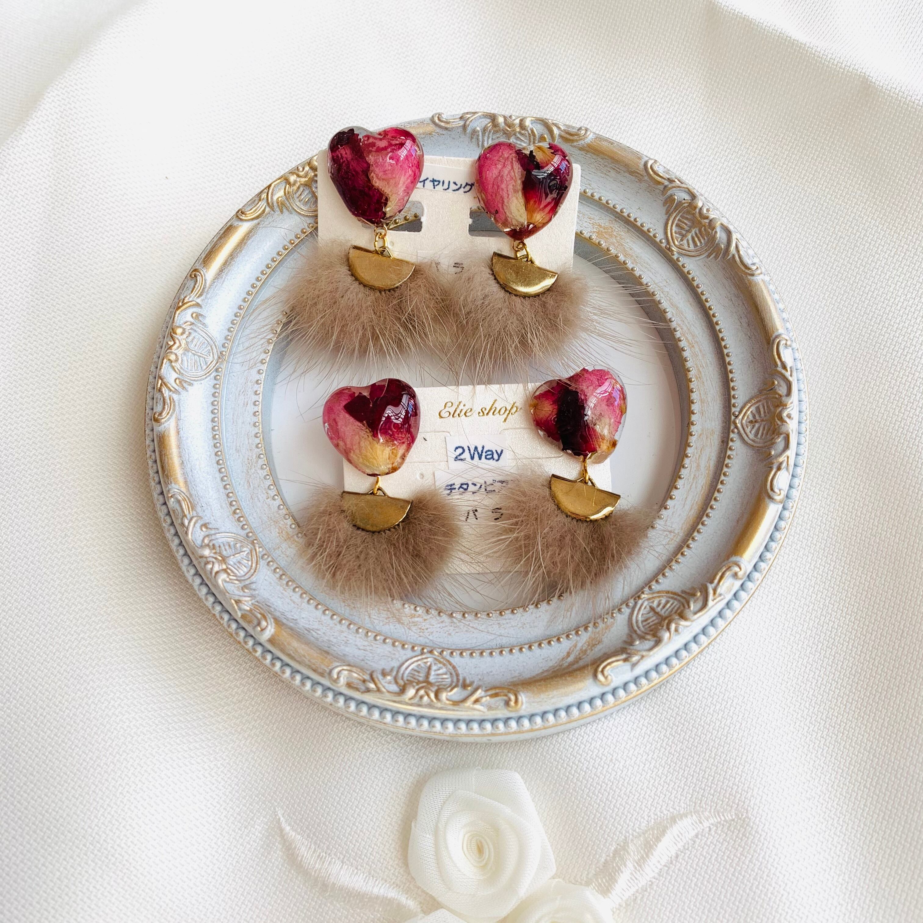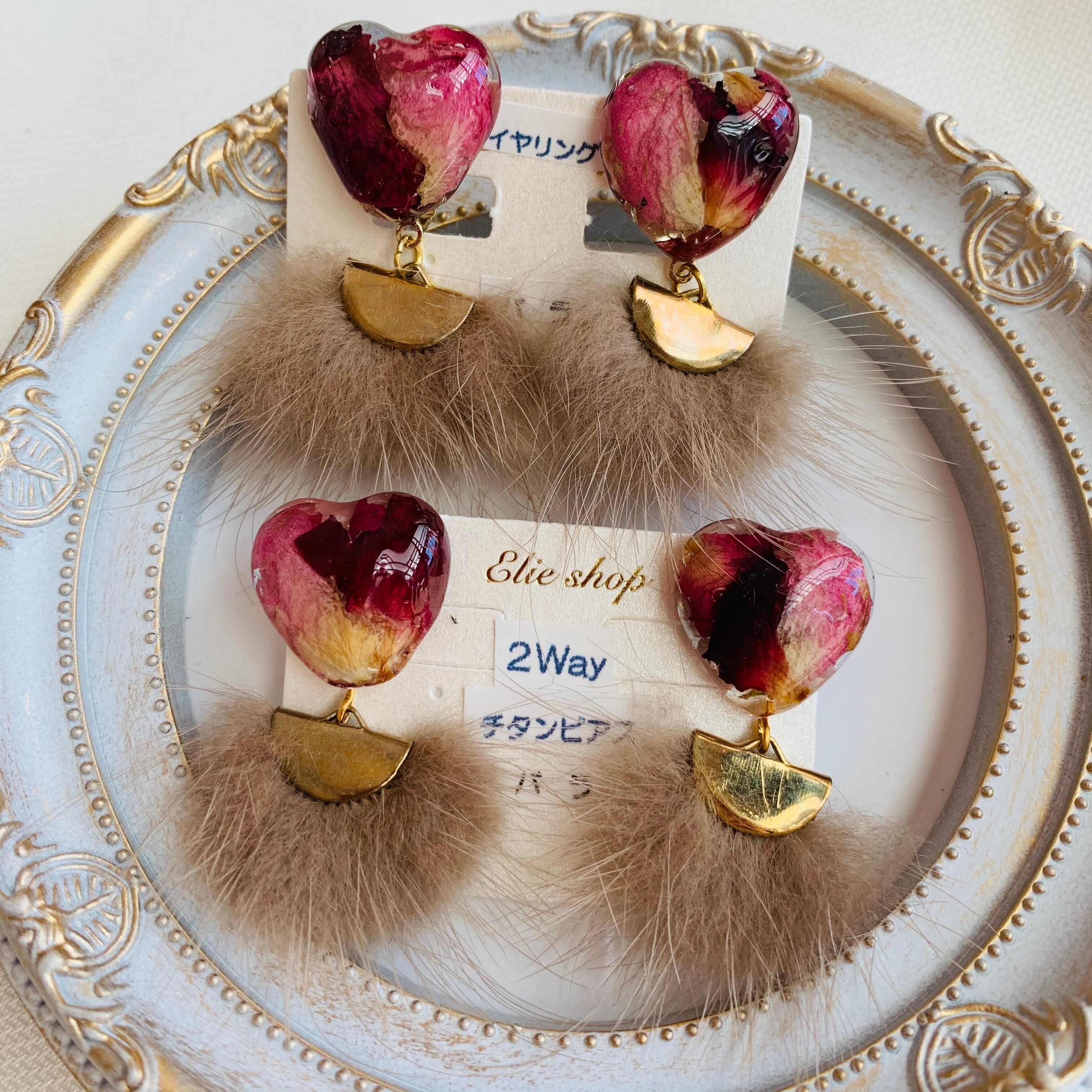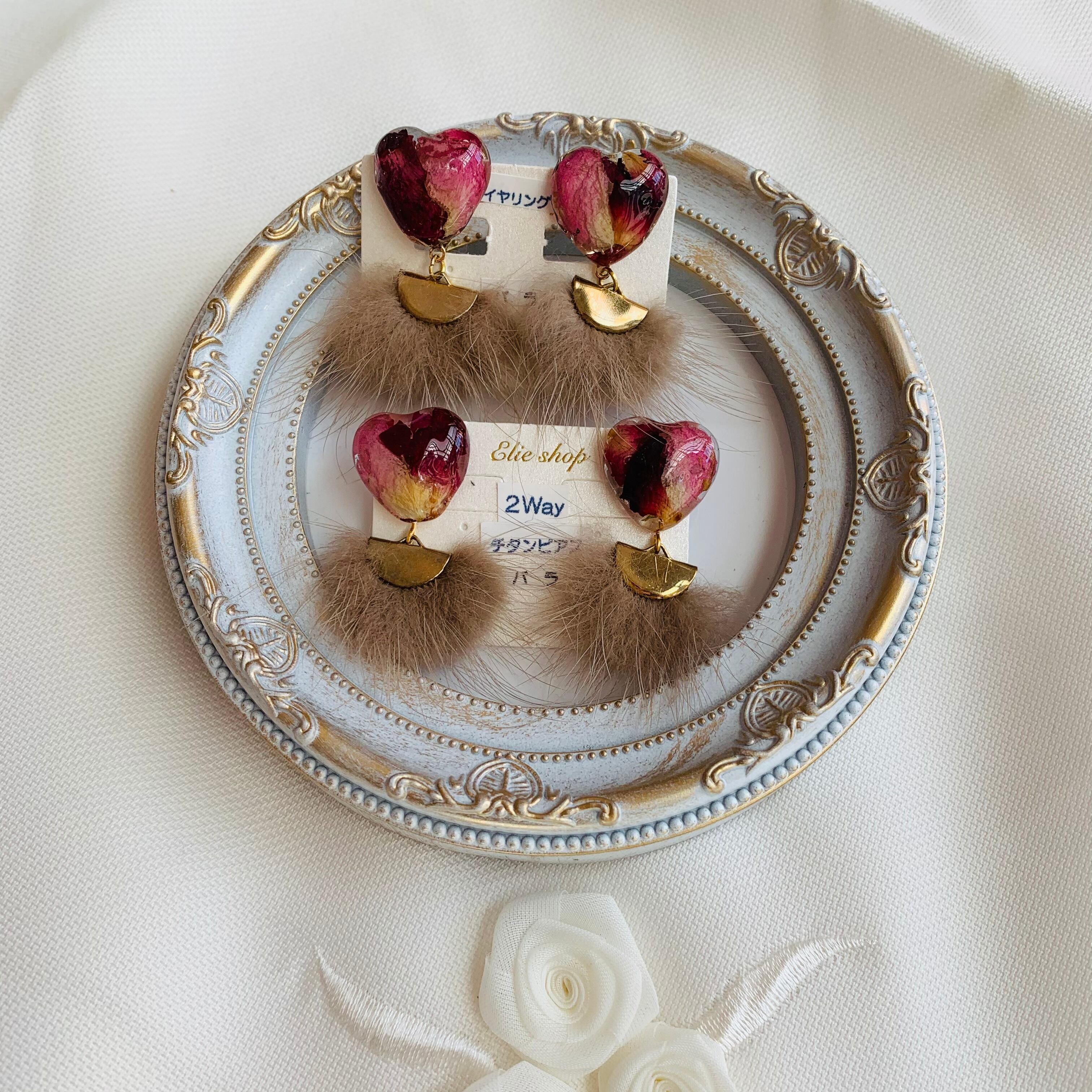 ご覧いただきありがとうございます♪ *バラのポプリとファーピアス*【イヤリング変更可能】 バラのポプリを ハートのレジンに閉じ込めて ブラウンのファーと合わせた 大人可愛いピアスです♡