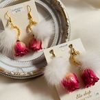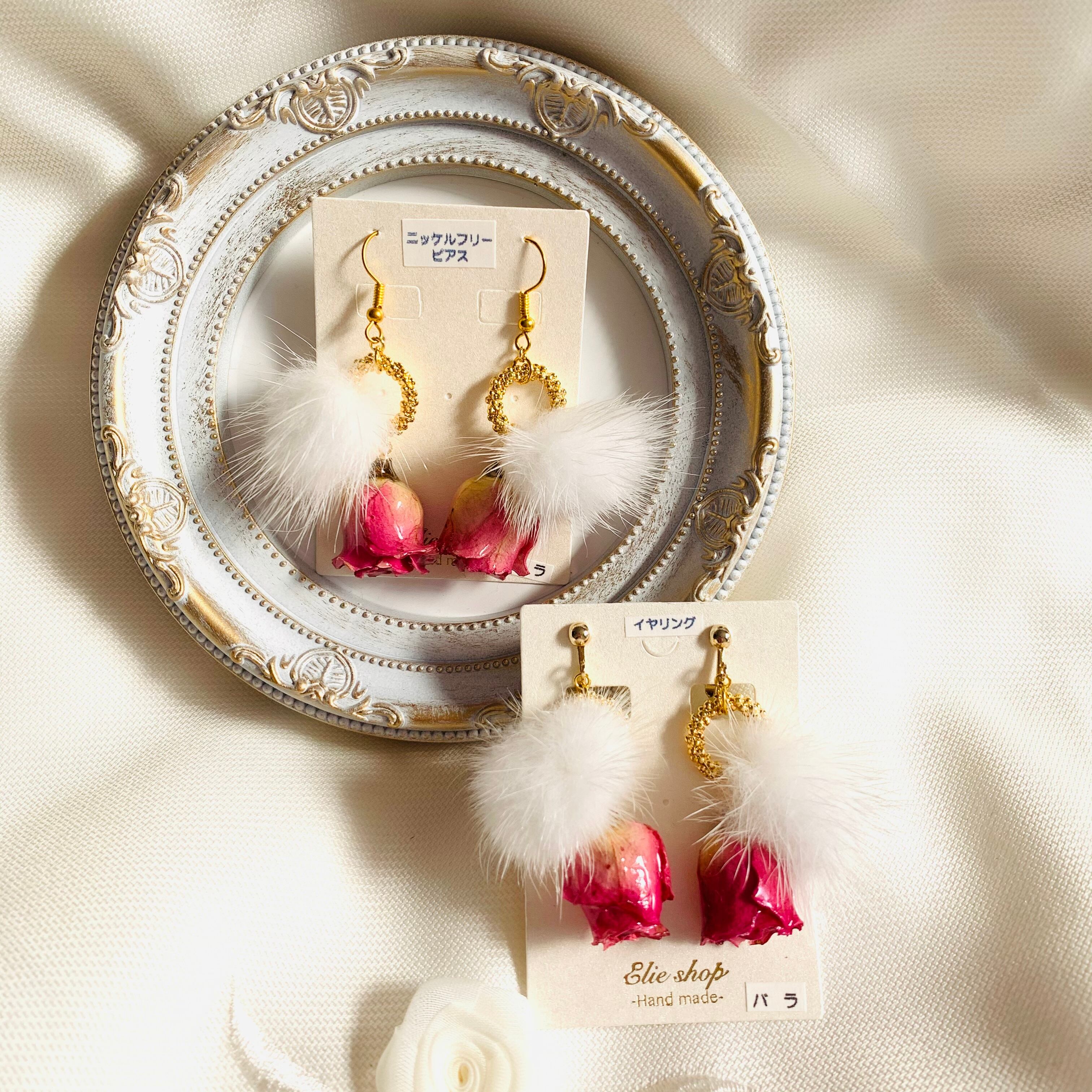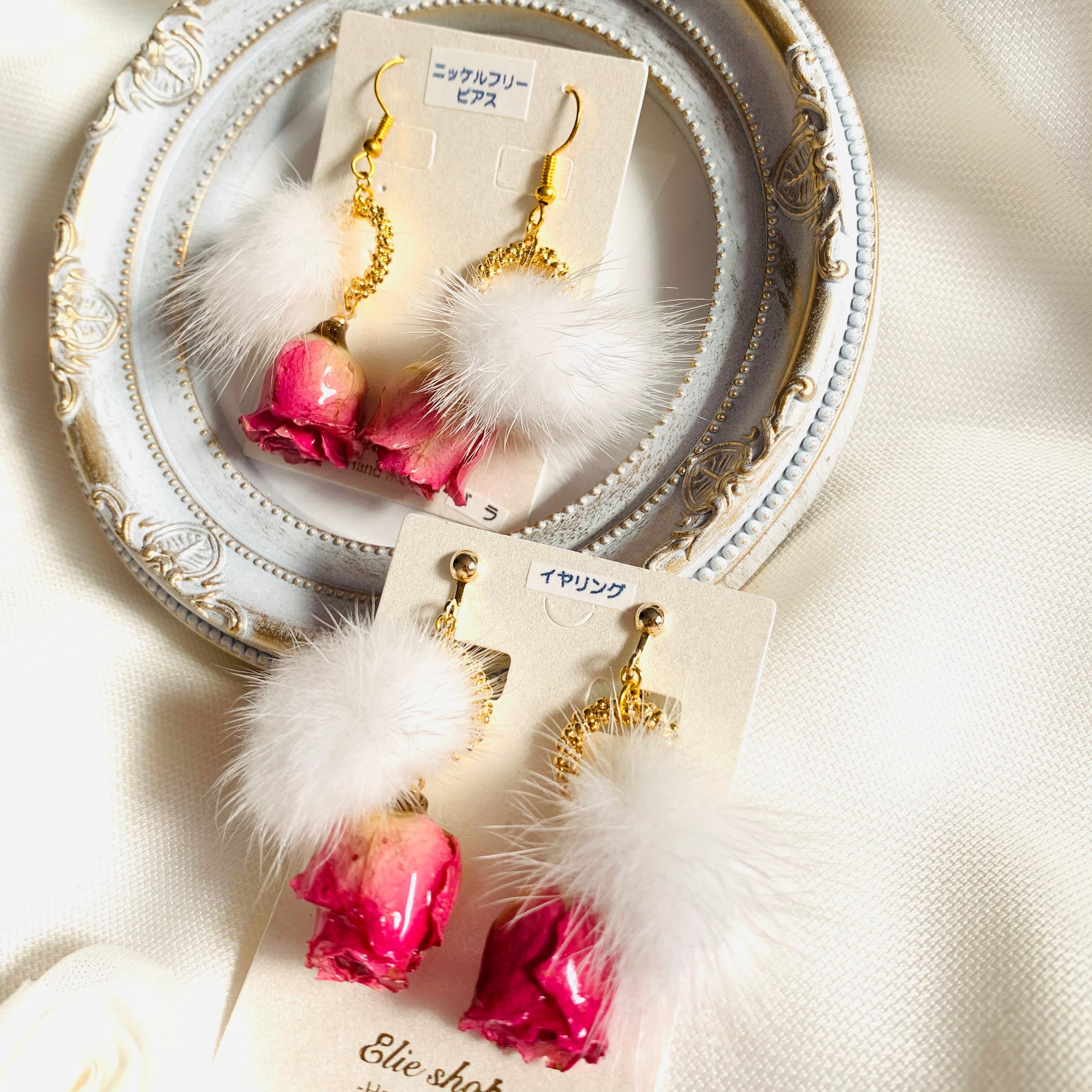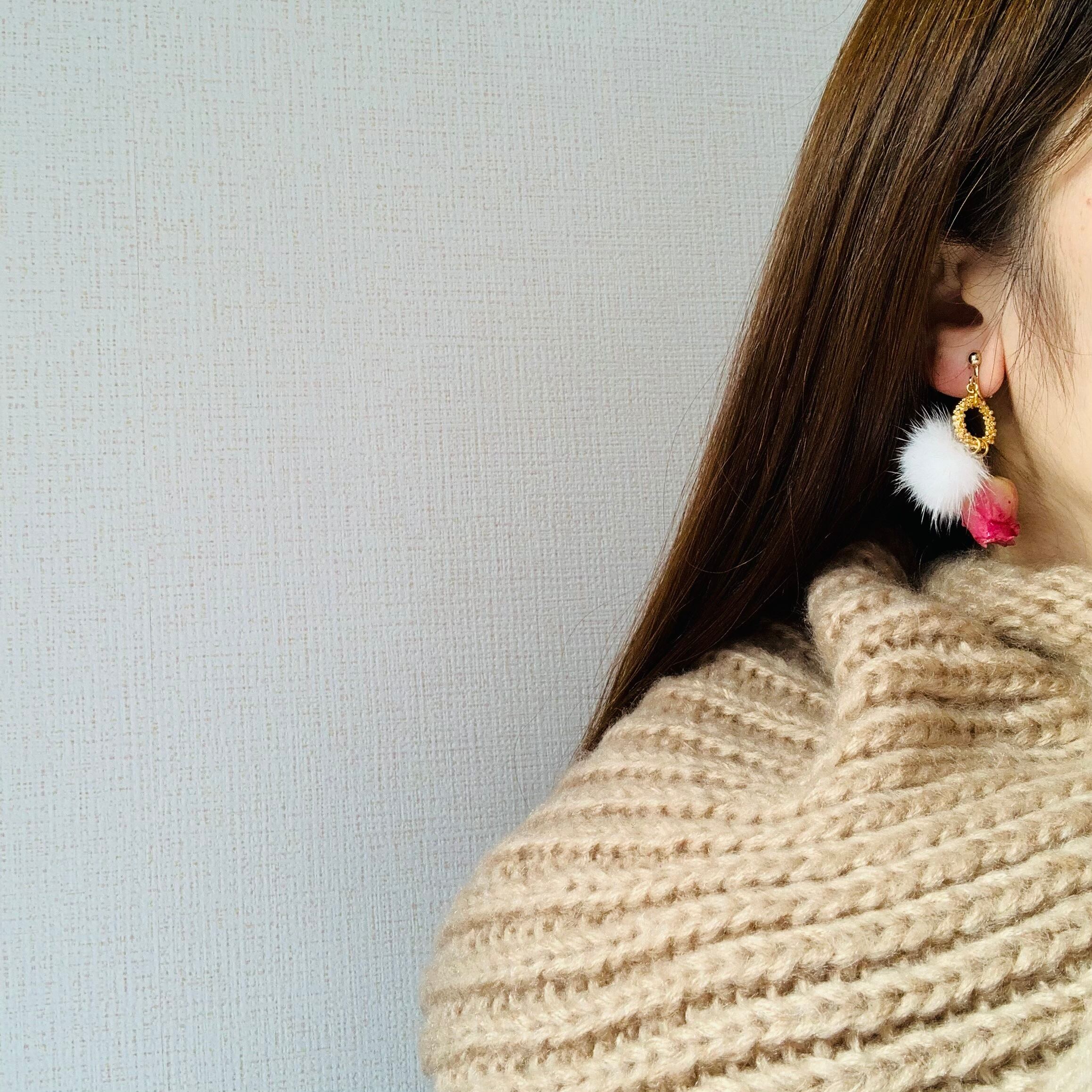 ご覧いただきありがとうございます* *バラとホワイトミンクファーのピアス*【イヤリング変更可能】 ころんと可愛いバラと ホワイトのファーを ミニフープに通した 大人可愛いピアスです♡