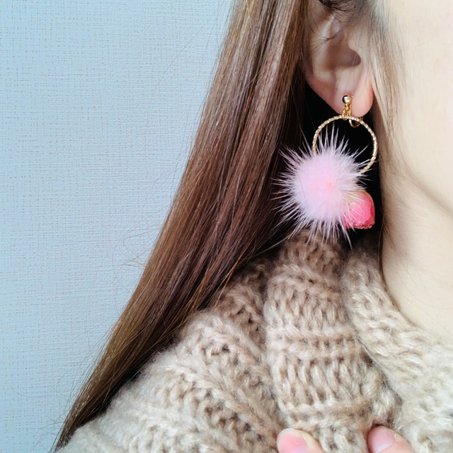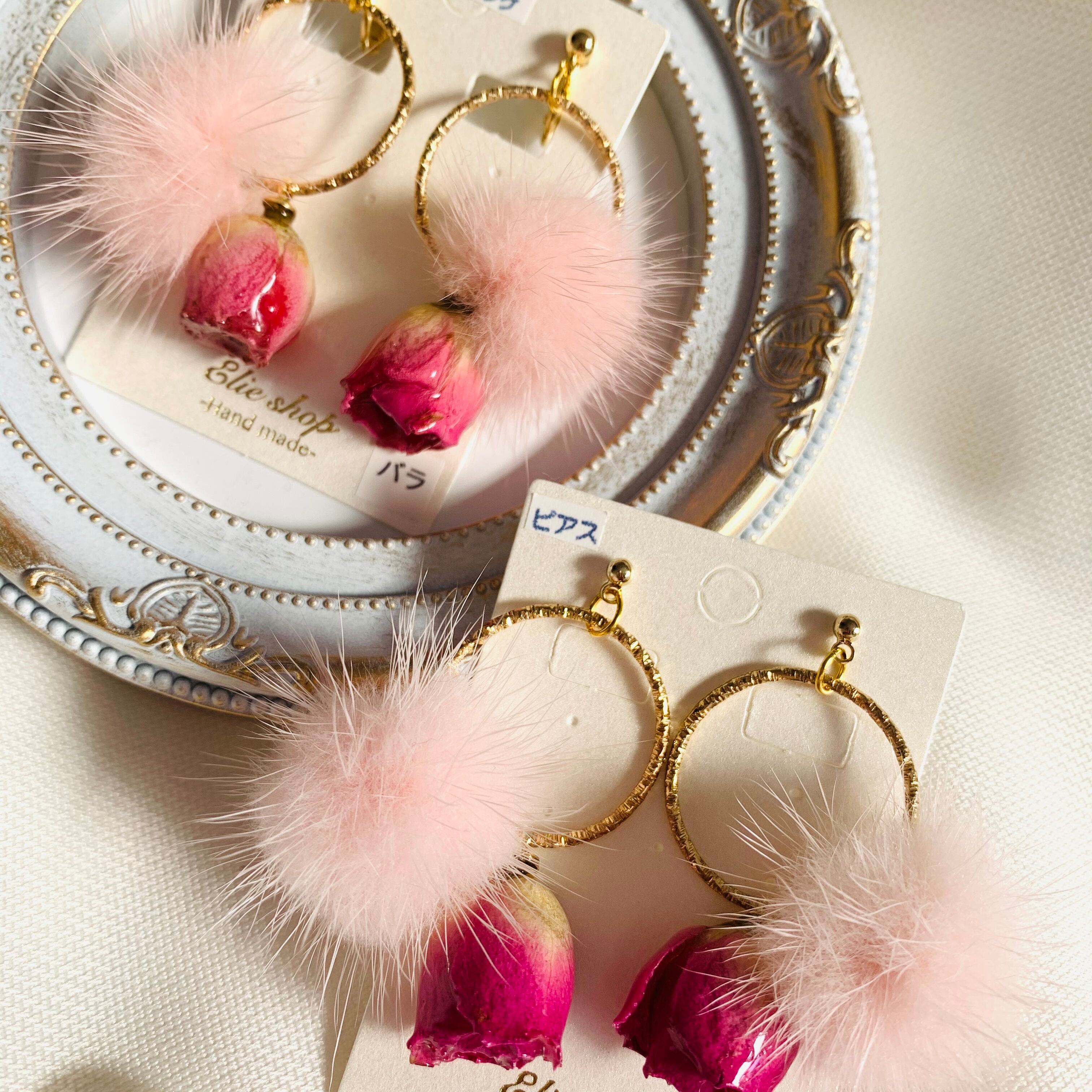 ご覧いただきありがとうございます* *バラとピンクミンクファーのピアス*【イヤリング変更可能】 ころんと可愛いバラと ピンクのファーを フープに通した 大人可愛いピアスです♡