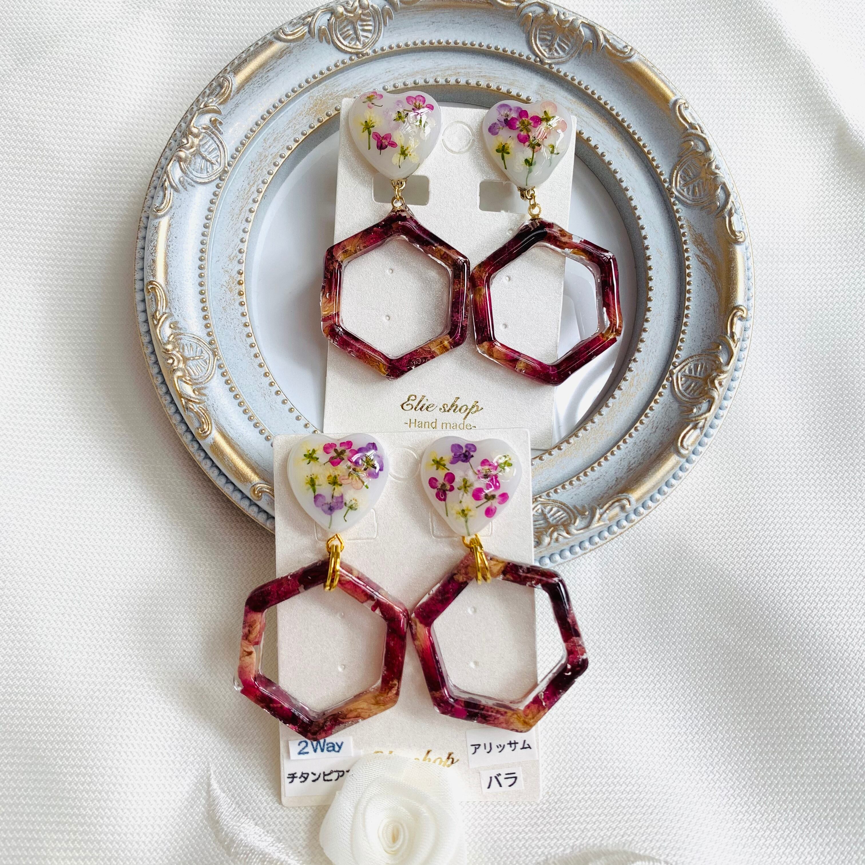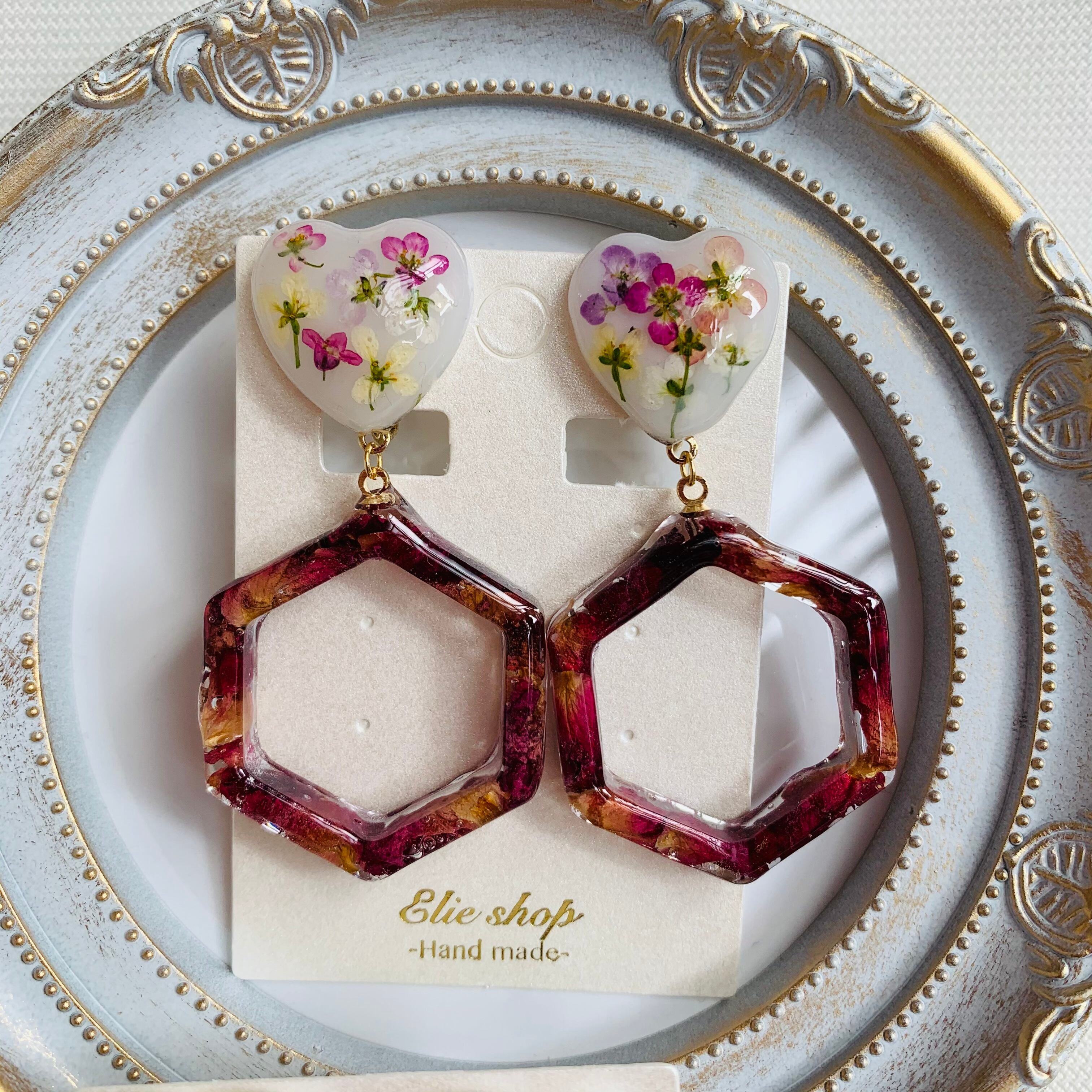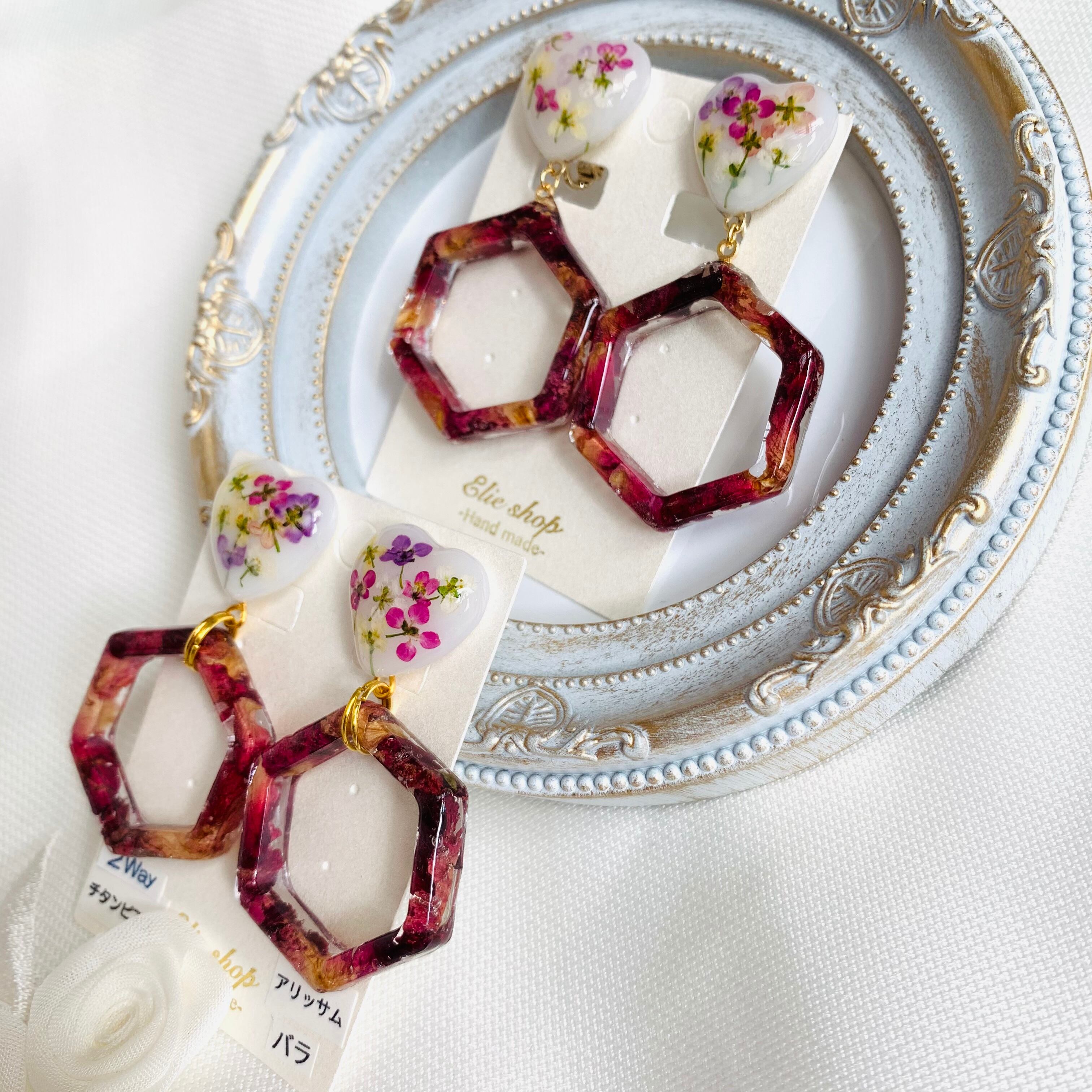 *アリッサムとバラのポプリピアス*【イヤリング変更可能】 アリッサムを閉じ込めたホワイトのハートに バラのポプリを閉じ込めたヘキサゴン形のパーツを合わせた お花いっぱいの鮮やかなアクセサリーです! *バラのポプリの香りはしません。