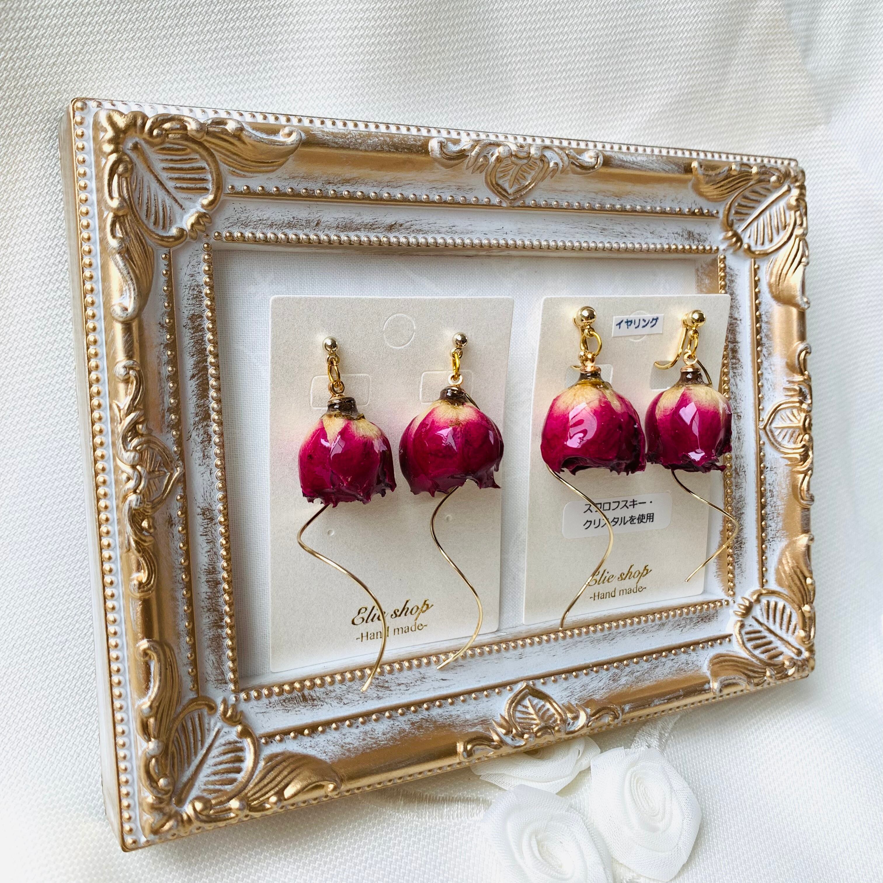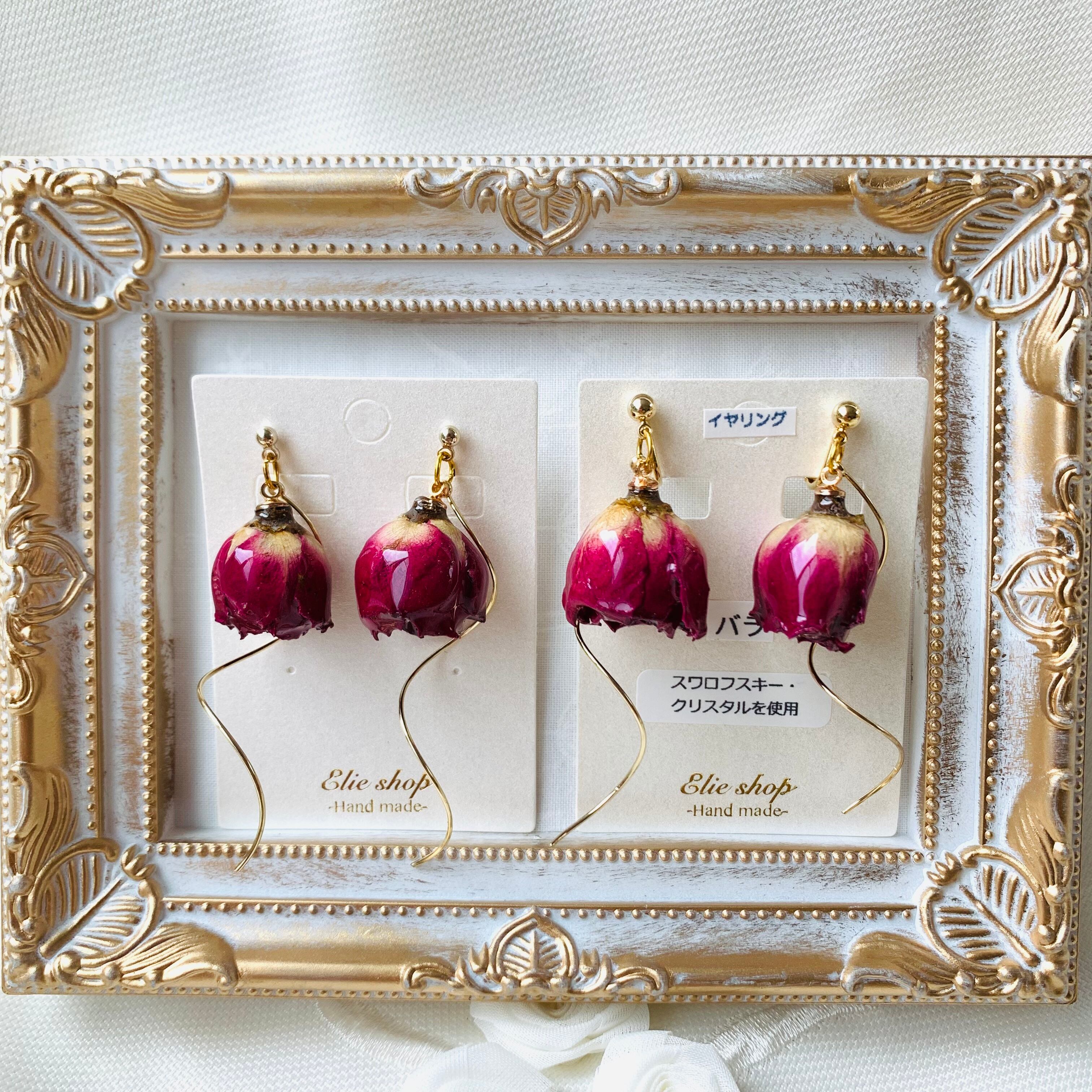 *バラのウェーブピアス*【イヤリング変更可能】 ウェーブパーツに大きめのバラを合わせたピアスです。 大きめサイズのバラがシンプルウェーブに映えます♡ *注意事項 本物のお花です。大きさや色味など一つ一つ違います。 光に当たらない場所に保管しておくと、退色しにくいです。