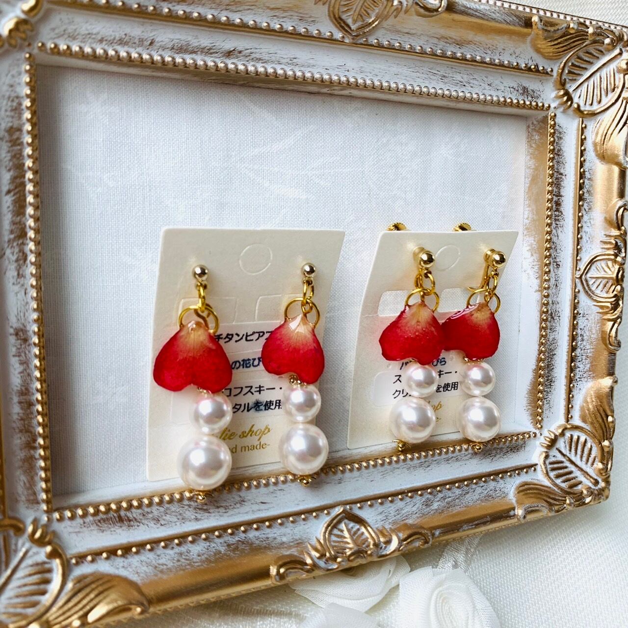 *バラの花びらとパールピアス*【イヤリング変更可能】