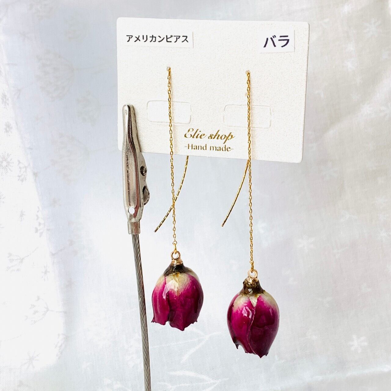 *バラのアメリカンピアス* 人気のバラシリーズ! シンプルですが存在感のある、バラのアメリカンピアスです! アメリカンピアスとは、ピアスホールにチェーンを通すタイプのピアスで、 ロングシルエットから、小顔効果を演出するともいわれています。
